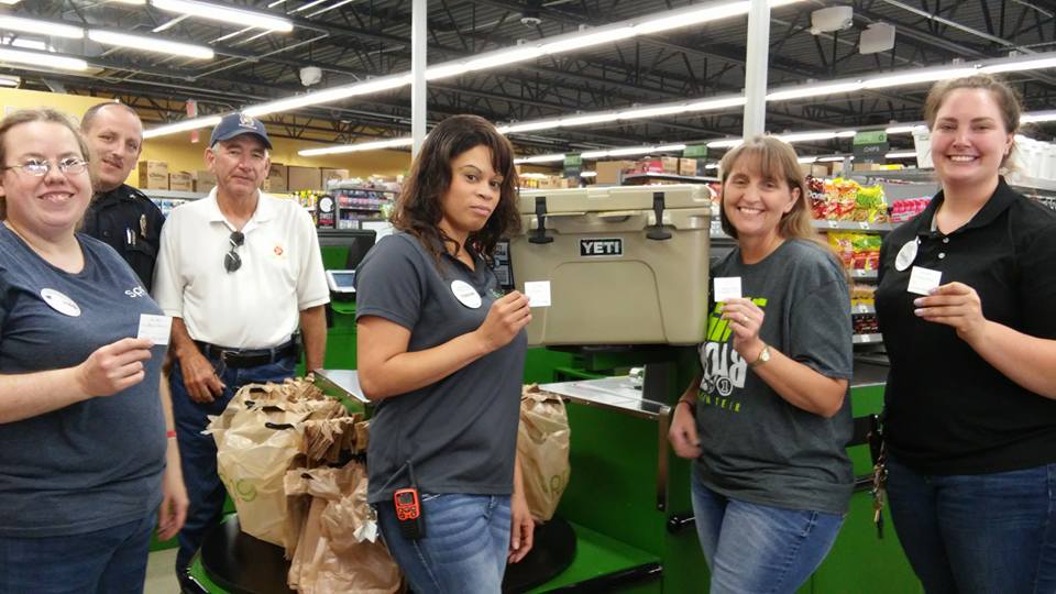 Shop With a Hero Raffle Winners « previous story album next » Spring Market employees with Fire Chief Don Chambers and Police Chief Cameron Beckham. The employees selected the four raffle winners. (Karen Mathiowetz) Download original photo