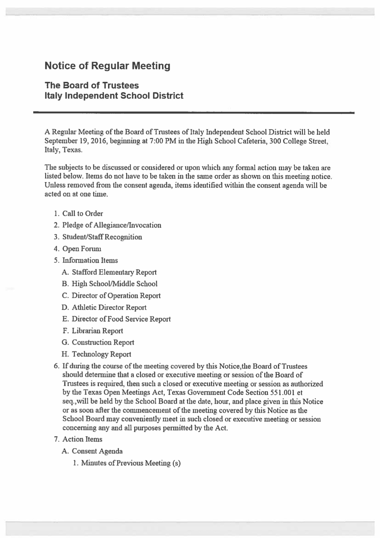 Agenda: Italy ISD School Board Meeting — Monday, September 19, 2016 « previous story album next » Download original photo