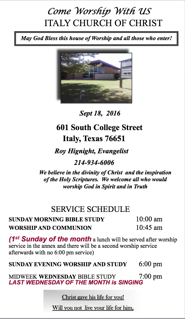 Italy Church of Christ Weekly Bulletin- September 18, 2016