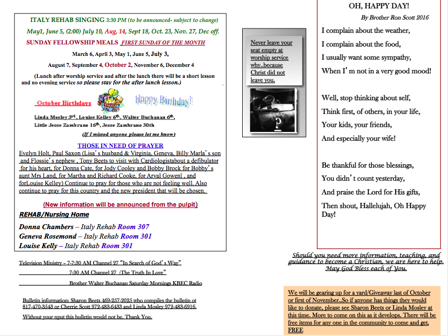 Italy Church of Christ Weekly Bulletin- October 2, 2016