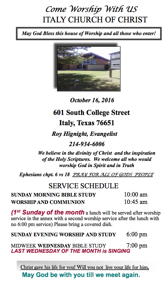 Italy Church of Christ Weekly Bulletin- October 16, 2016 « previous story album next » Download original photo