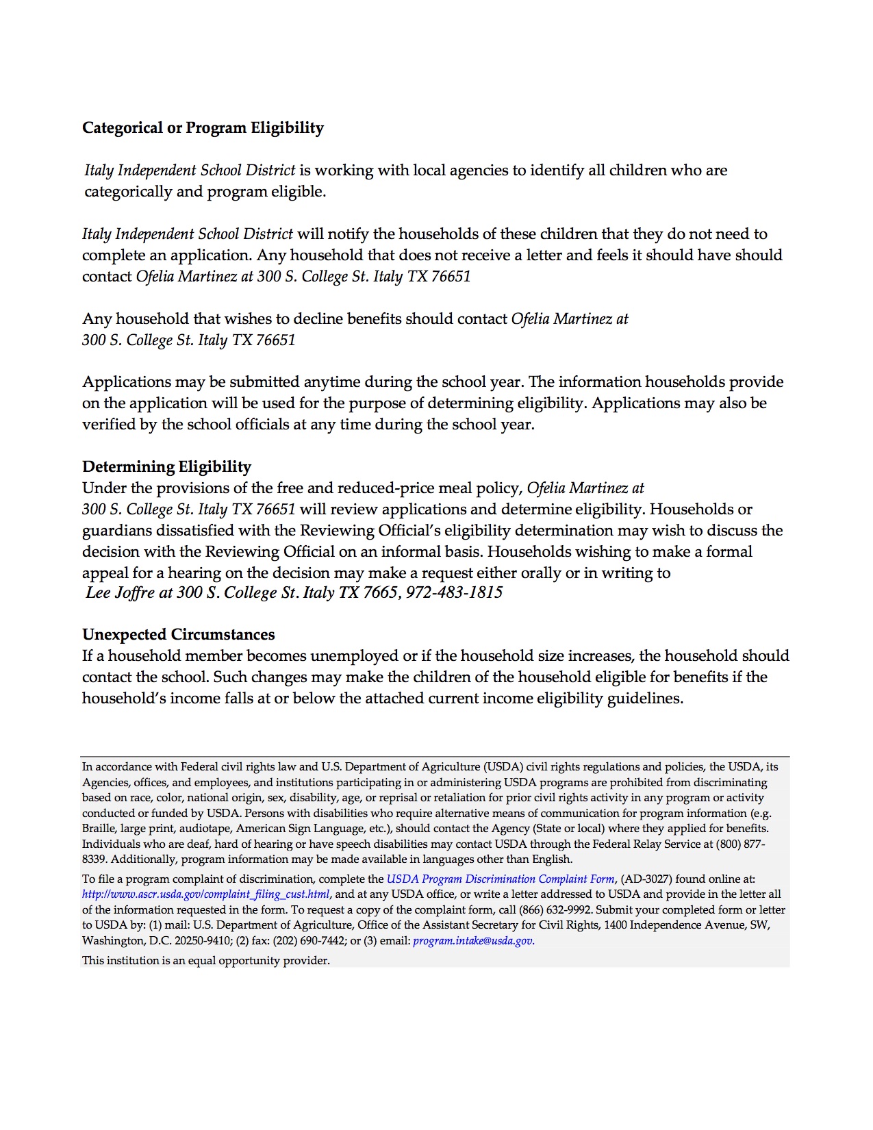 Italy ISD Free and Reduced Lunch Policy