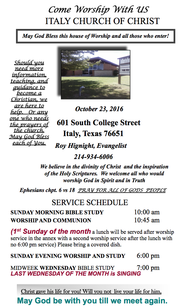 Italy Church of Christ Weekly Bulletin- October 23, 2016 « previous story album next » Download original photo