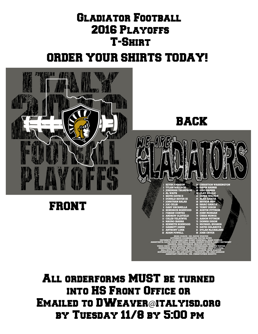 Italy Football Playoff Shirts Available – Must Submit Order by Tuesday @ 5 p.m.! « previous story album next » (Submitted photo) Download original photo