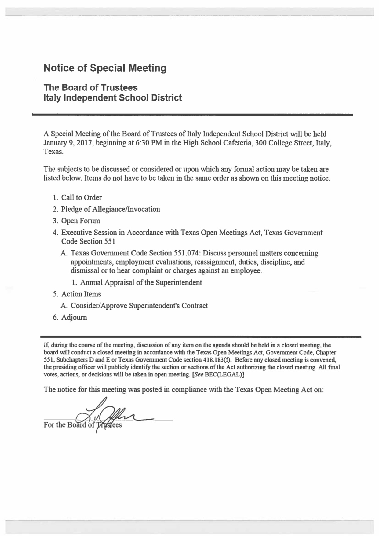 Agenda: Italy ISD School Board Called Meeting — Monday, January 9, 2017 « previous story album next » Download original photo