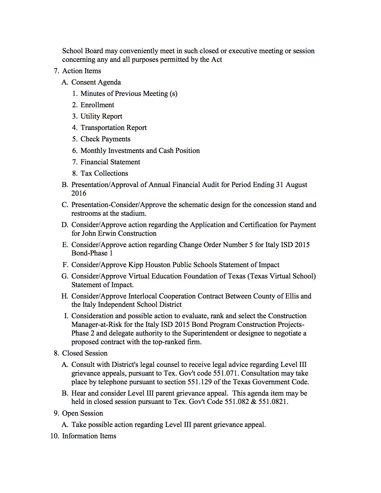 Agenda: Italy ISD School Board Meeting – Tuesday, January 17, 2017 « previous story album next » Download original photo