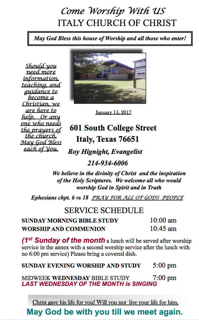 Italy Church of Christ Weekly Bulletin — January 15, 2017 « previous story album next » Download original photo