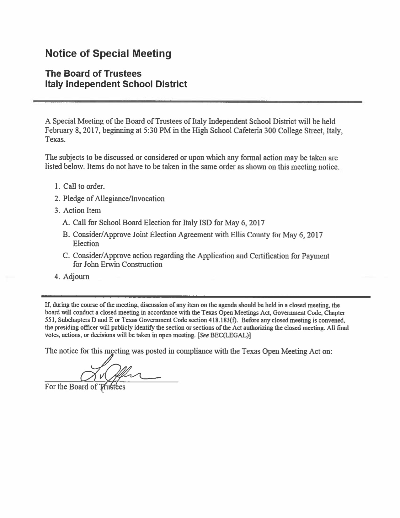Agenda: Italy ISD School Board Called Meeting—Wednesday, February 8, 2017 « previous story album next » Download original photo