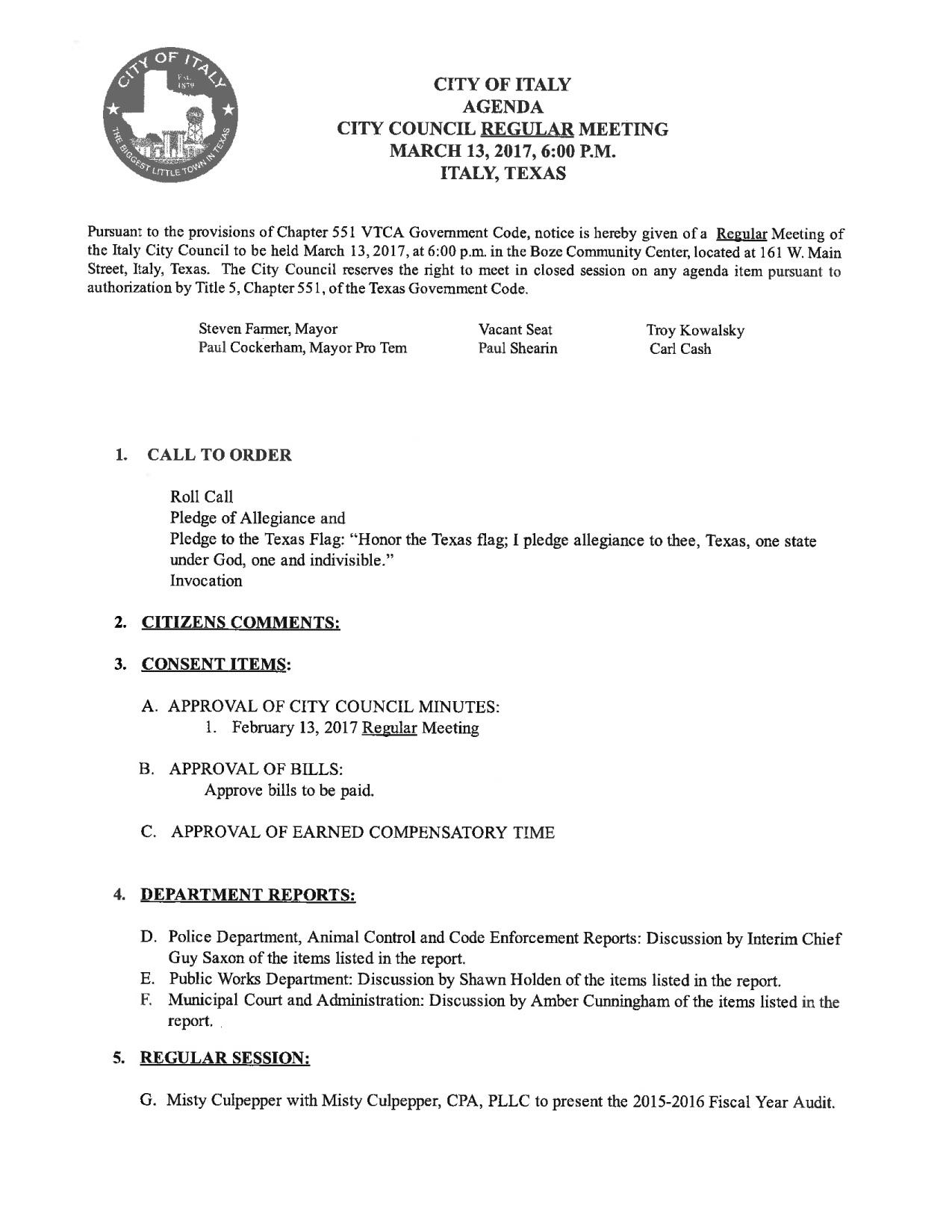 Agenda: Italy City Council Meeting — Monday, March 13, 2017 « previous story album next » Agenda – pg 1 Download original photo