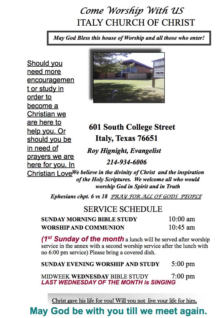 Italy Church of Christ Weekly Bulletin — April 9, 2017 « previous story album next » Download original photo