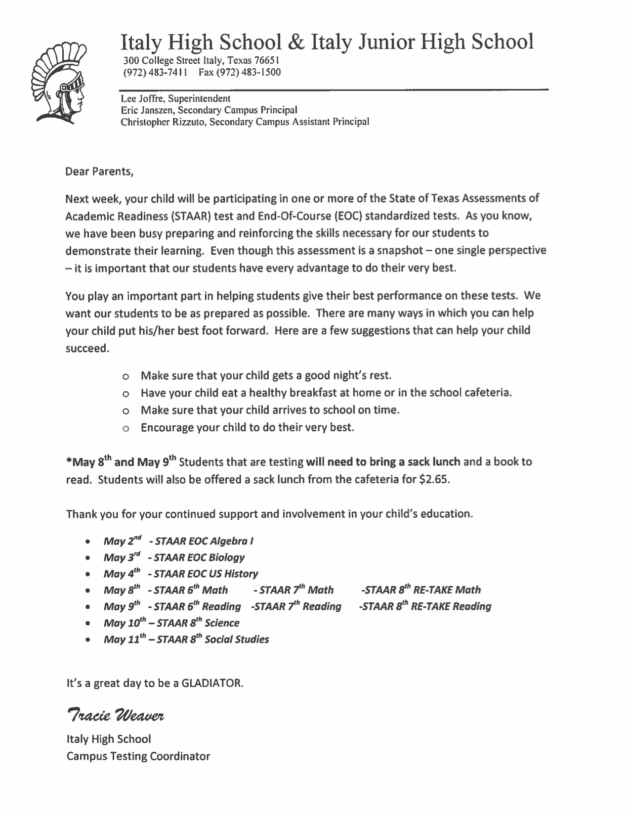 Testing week information for Italy High School/Junior High School « previous story album next » Download original photo