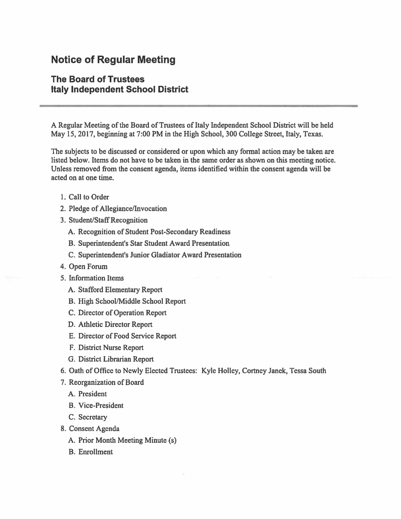 Agenda: Italy ISD School Board Meeting—Monday, May 15, 2017 « previous story album next » Download original photo