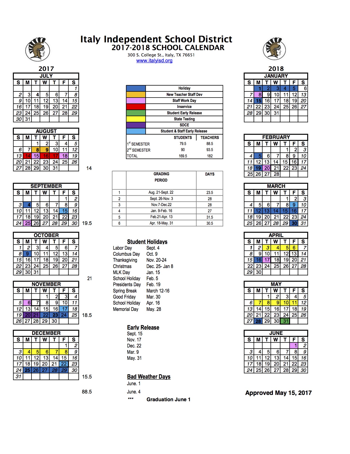Italy ISD 2017-2018 School Calendar