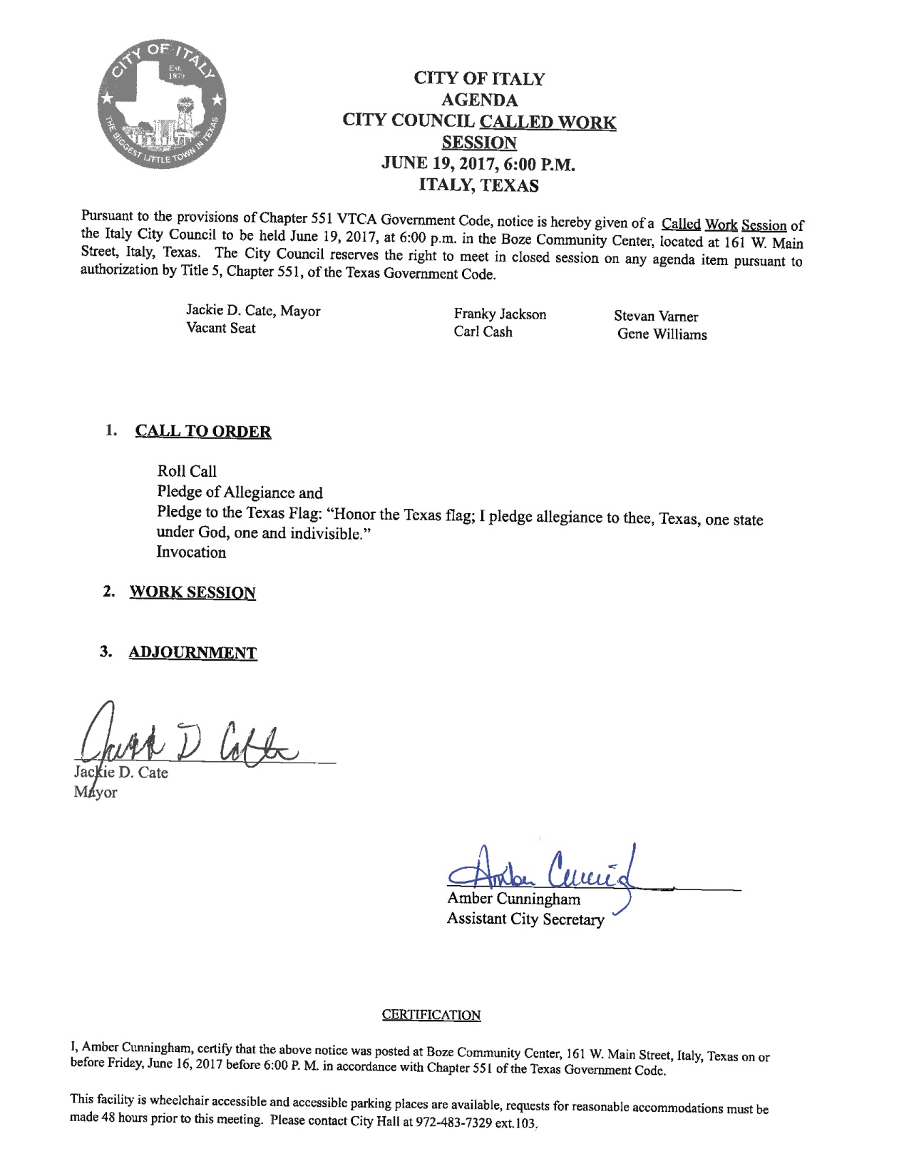 Agenda: Italy City Council Called Work Session — Monday, June 19, 2017 « previous story album next » Download original photo