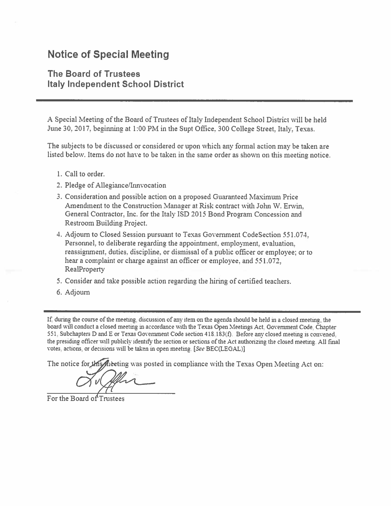 Agenda: Italy ISD School Board Called Meeting – Friday, June 30, 2017 « previous story album next » Download original photo