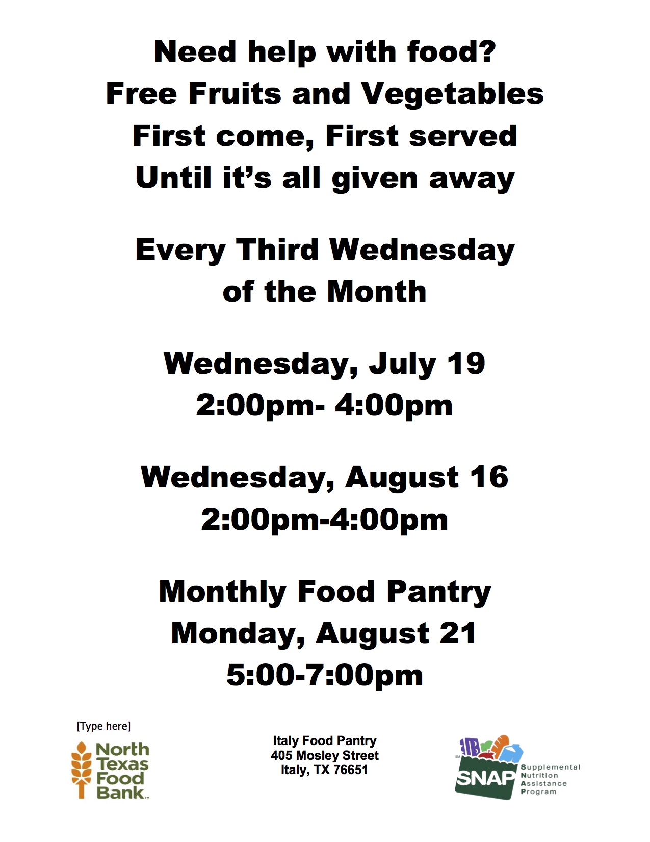Italy Food Pantry schedule for July and August 2017 « previous story album next » Download original photo