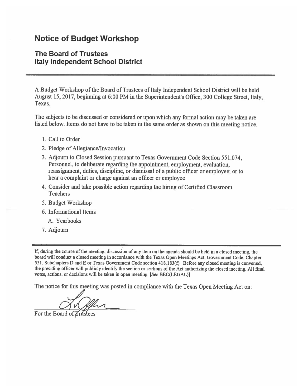 Agenda: Italy ISD School Board Budget Workshop – Tuesday, August 15, 2017 « previous story album next » Download original photo