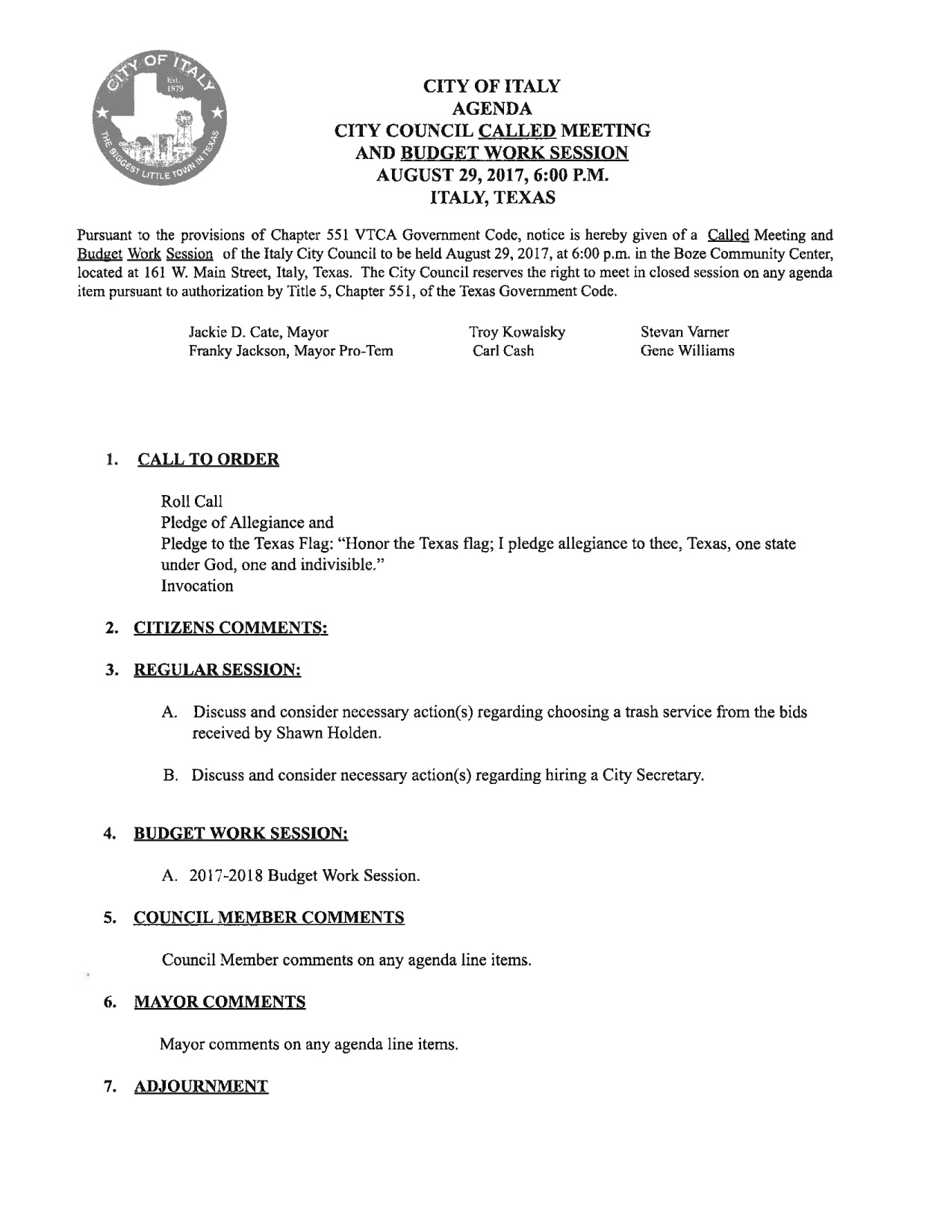 Agenda: Italy City Council Called Meeting/Budget Workshop — August 29, 2017 « previous story album next » Download original photo