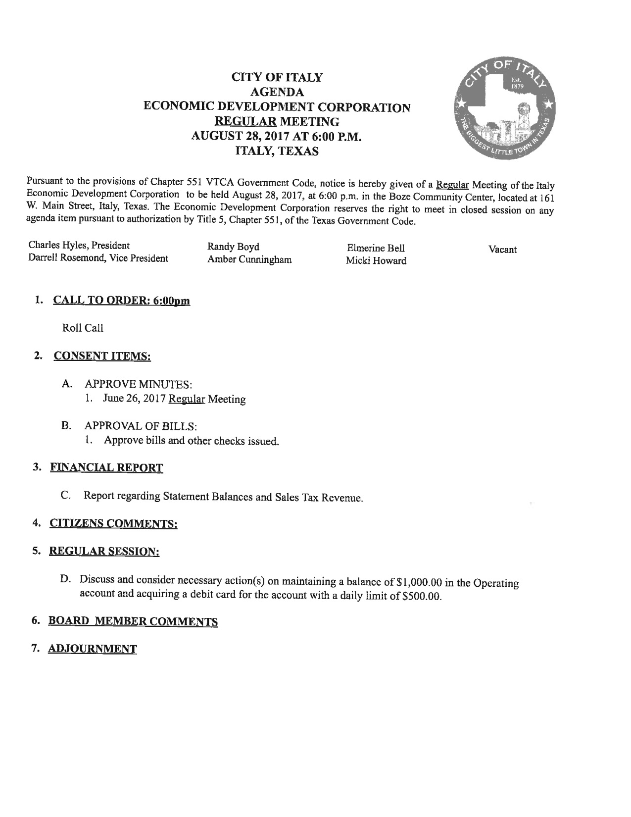 Agenda: Italy Economic Development Corporation Meeting — Monday, August 28, 2017 « previous story album next » Download original photo