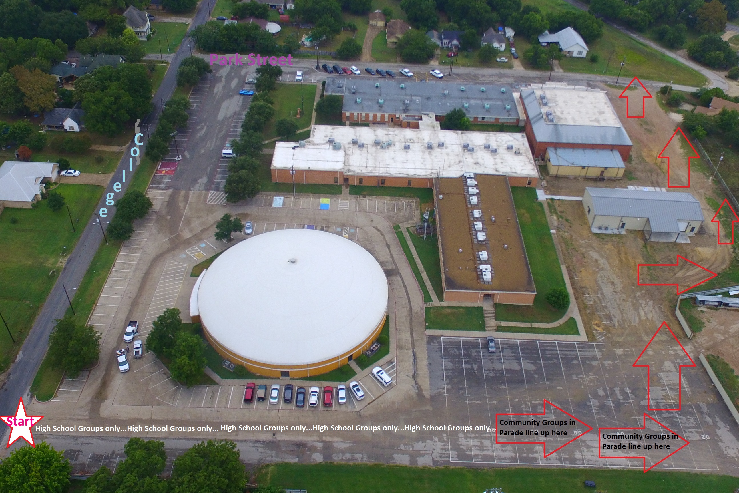 Non high school floats and parade participants should enter the line up on Park Street to the East of the Old Gym. Please do not proceed beyond the Dome as this space is reserved for the Police, CAP Color Gaurd, Band, Cheerleaders, Princesses, King/Queen Nominees, Football and Volleyball teams.