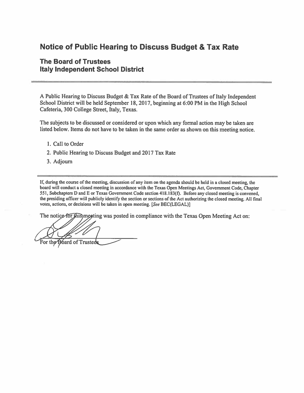 Agenda: Italy ISD School Board Public Hearing — Monday, September 18, 2017 « previous story album next » Download original photo