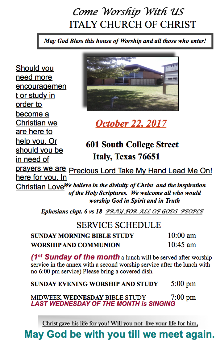 Italy Church of Christ Weekly Bulletin — October 22, 2017