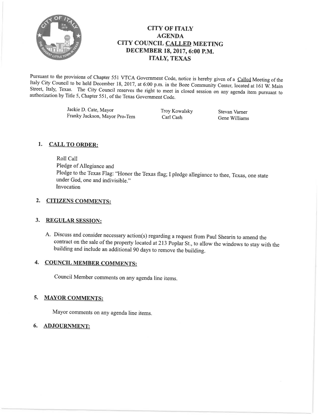 Agenda: Italy City Council Called Meeting – Monday, December 18, 2017