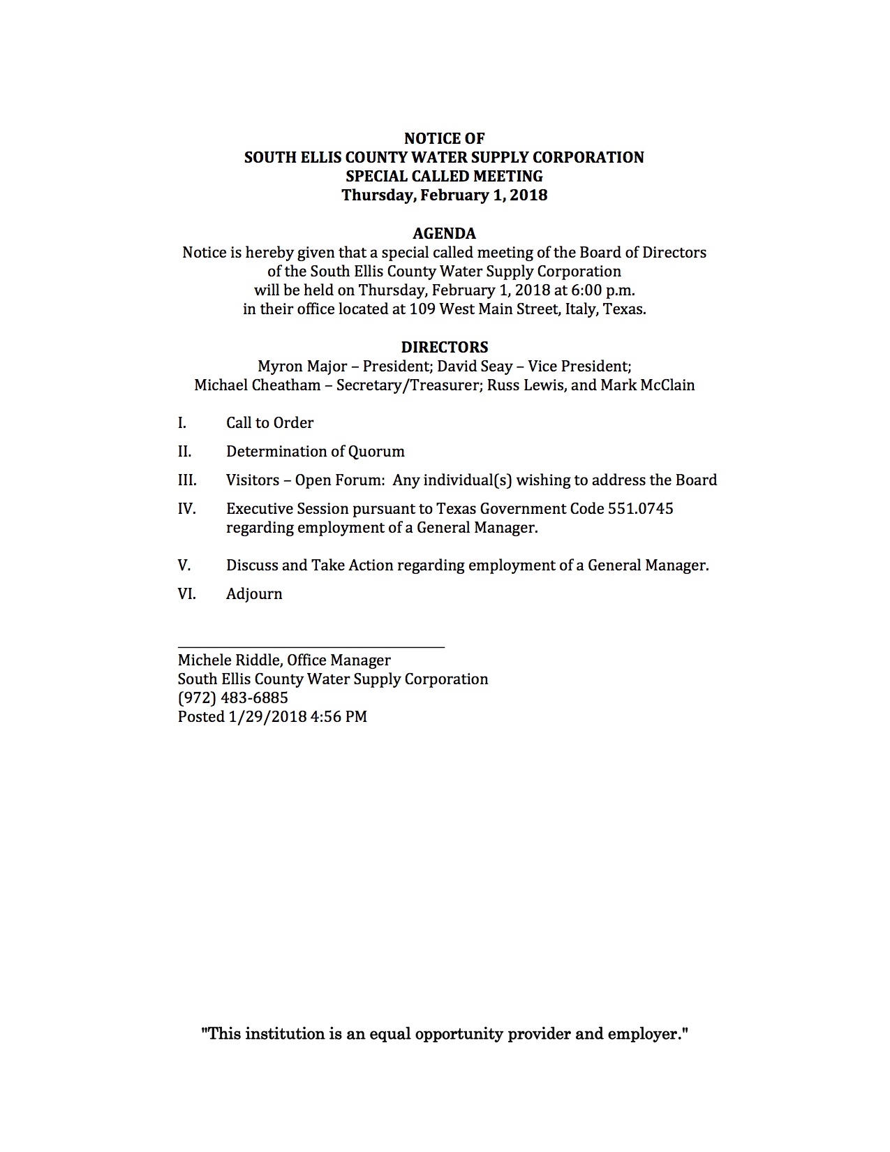 Agenda: South Ellis County Water Supply Corp. Called Meeting—Thurs. Feb 1, 2018 « previous story album next » Download original photo