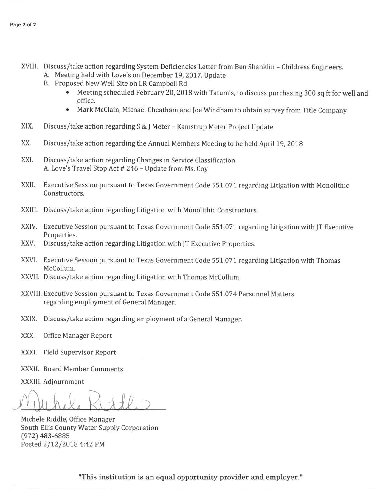 Agenda: South Ellis County Water Supply Corp. Meeting—Thurs. Feb 15, 2018