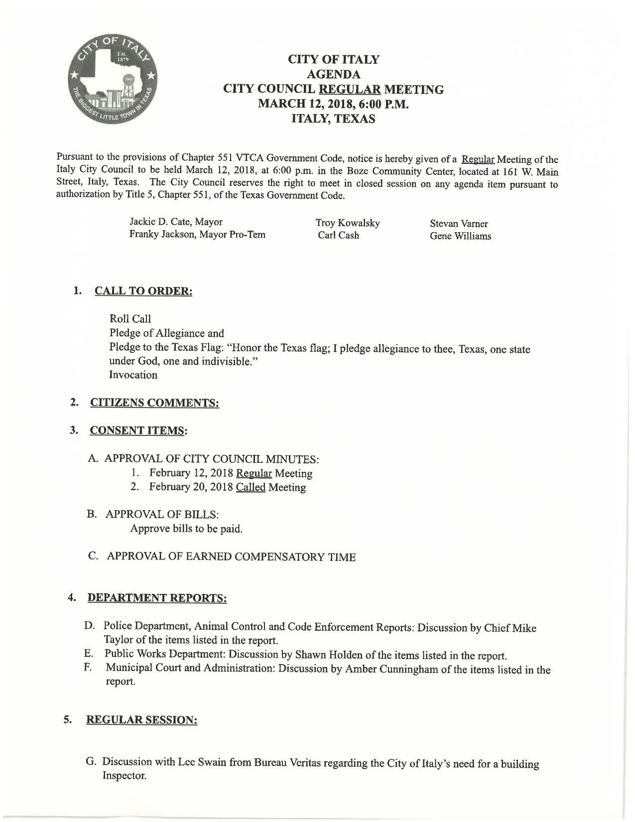 Agenda: Italy City Council Meeting — Monday, March 12, 2018