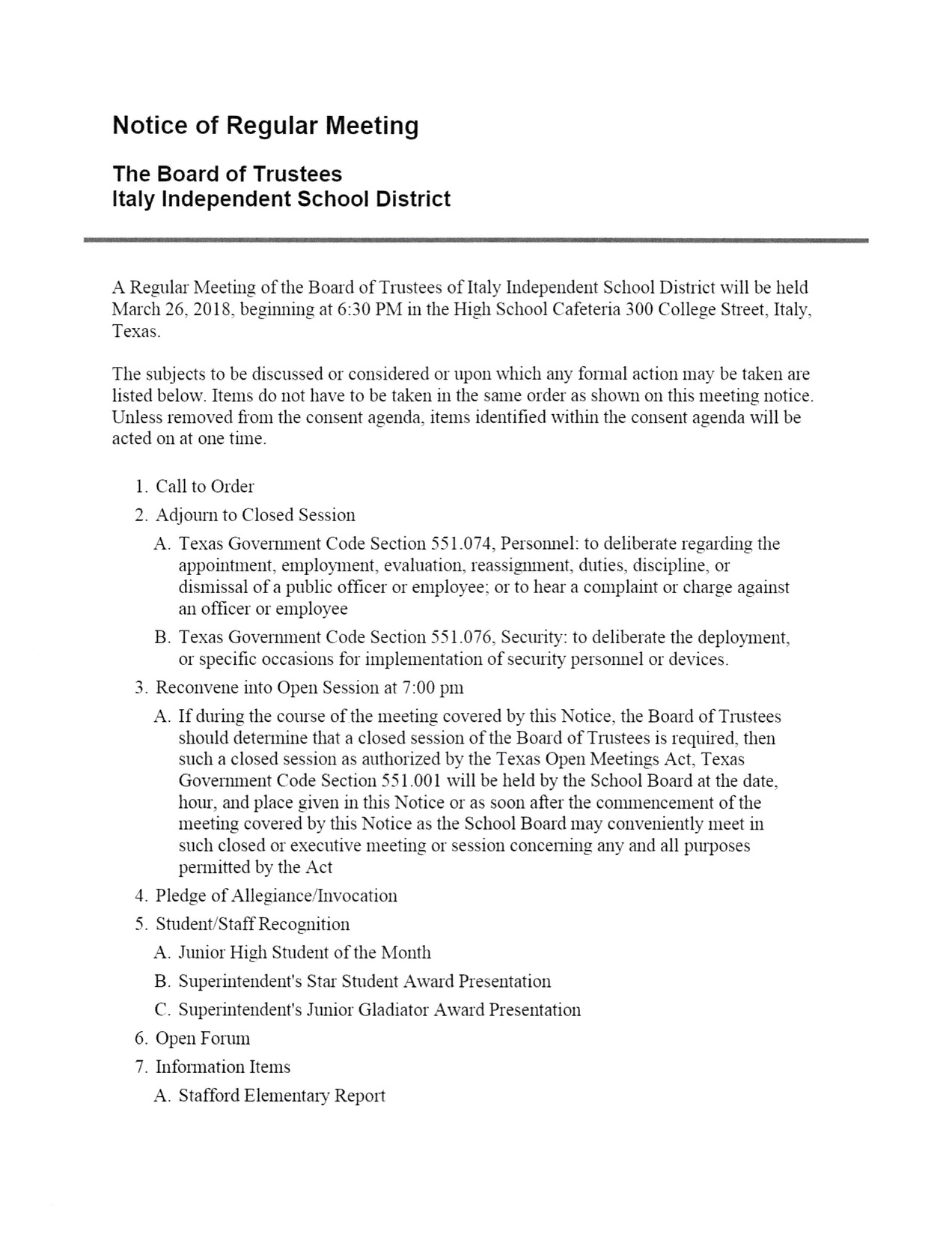Agenda: Italy ISD School Board Meeting — Monday, March 26, 2018 « previous story album next » Download original photo