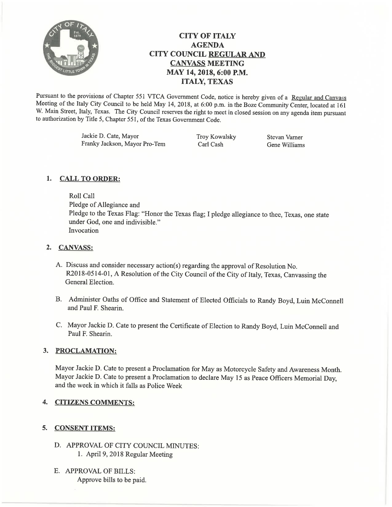 Agenda: Italy City Council Meeting — Monday, May 14, 2018 « previous story album next » Download original photo