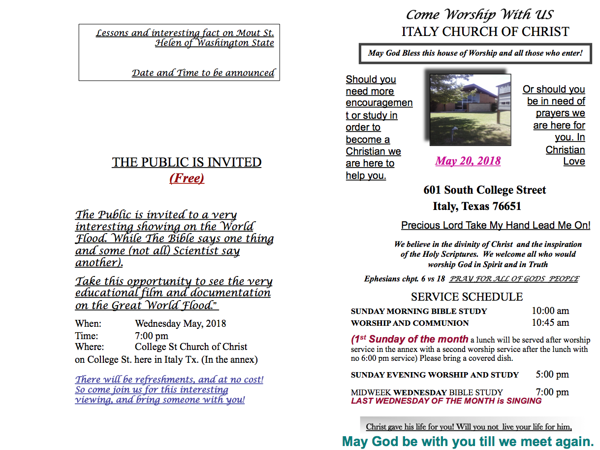 Italy Church of Christ Weekly Bulletin — May 20, 2018 « previous story album next » Download original photo